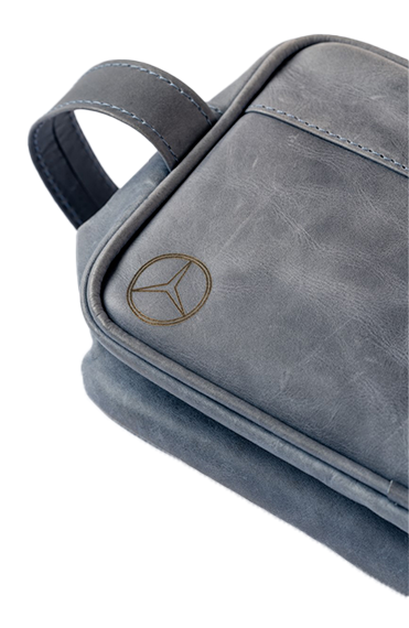 Neceser Mercedes Benz Ancho con 2 compartimientos para llevar contigo objetos personales y de uso cotidiano. Ideal para oficina y viajes. Este producto está hecho en cuero original.