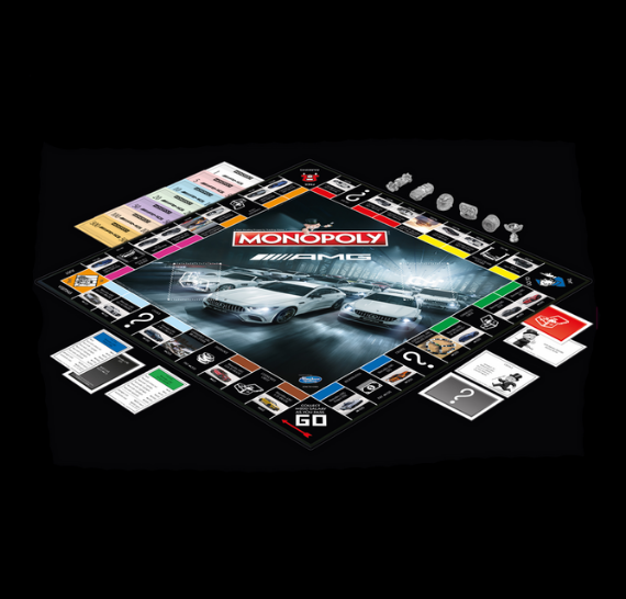 Monopoly edición Mercedes-AMG, con tablero y seis figuras exclusivas, garajes y circuitos en lugar de casas y hoteles. Diversión asegurada para mayores de 12 años, presentado en caja de diseño especial, perfecto como regalo.