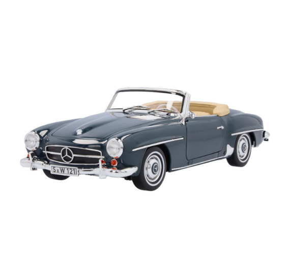 Maqueta a escala 1:18 del Mercedes-Benz 190 SL Roadster (W121), un clásico deportivo-elegante inspirado en el legendario 300 SL. Fabricada en fundición de cinc con detalles en plástico, destaca por su alta fidelidad, pintura en color original y un interior reproducido con precisión. Incluye puertas, capó y maletero practicables, además de hardtop, capota, destornillador para su extracción del embalaje y guante para evitar huellas. Montada a mano con más de 120 piezas. Longitud aproximada: 23,8 cm. Fabricada para Mercedes-Benz por Norev.