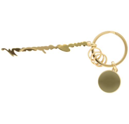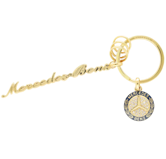 Llavero dorado de la Colección Mercedes-Benz Classic, fabricado en acero inoxidable y decorado con cristales. Presenta la clásica inscripción Mercedes-Benz y un anillo hendido con tres minianillos para añadir o retirar llaves fácilmente. Longitud aproximada de 11 cm.
