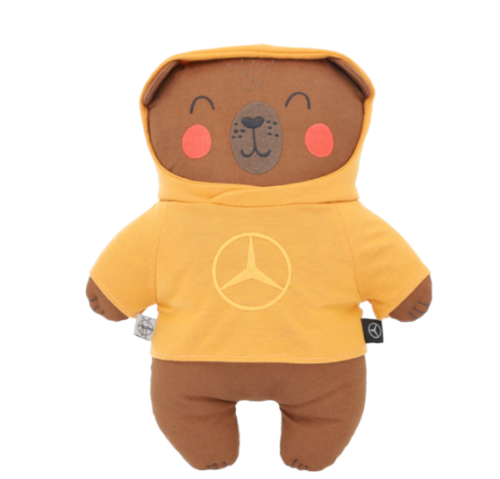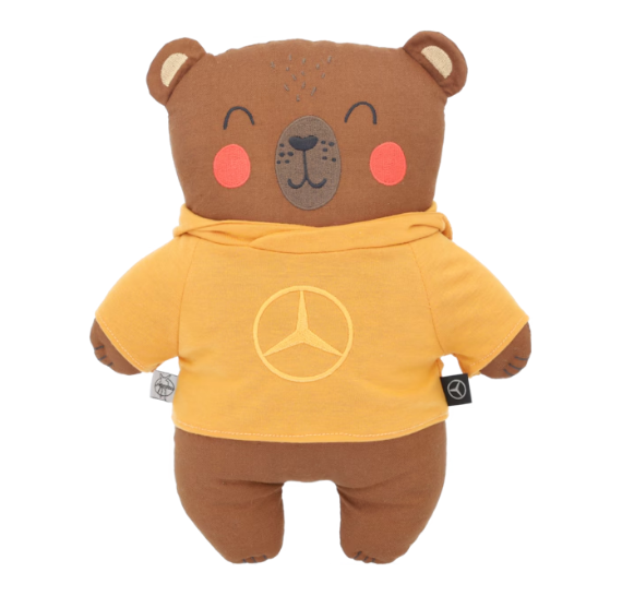 Osito de peluche Mercedes-Benz by Lässig en marrón con sudadera naranja y logotipo bordado. Fabricado en algodón y lino, relleno de poliéster, estimula el tacto y la vista de los niños desde 2 meses. Lavable a 30 °C
