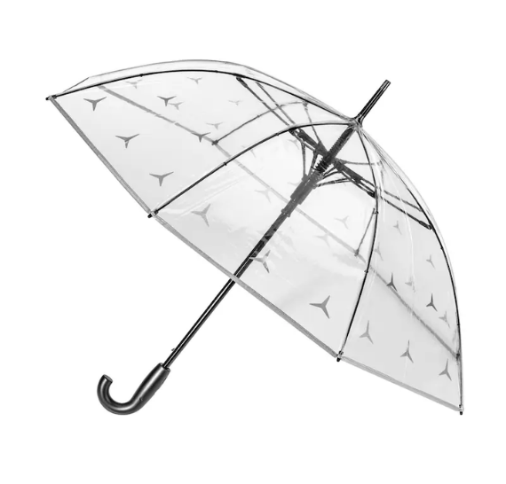 Paraguas Mercedes-Benz transparente con patrón plata, diseñado para resistir todo tipo de clima gracias a su sistema a prueba de ráfagas de viento. Cuenta con bastidor de fibra de vidrio, puntas de plástico y mango negro con recubrimiento UV de plástico reciclado para mayor durabilidad. Diámetro abierto 105cm. Longitud cerrado 86cm.