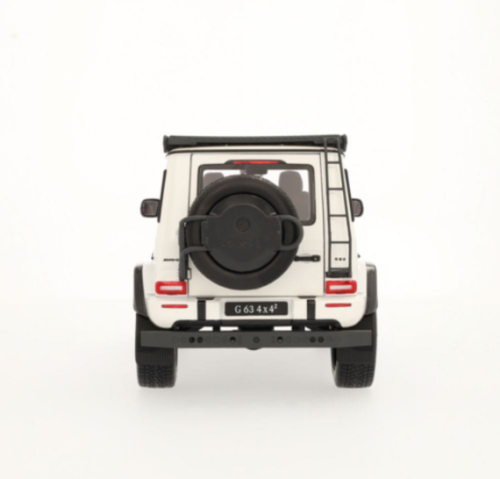 Maqueta a escala 1:18 del Mercedes-AMG G 63 4x4² W463, montada a mano con más de 130 piezas en fundición de cinc y plástico, pintada en el color auténtico y con interior detallado de alta fidelidad. Incluye seis piezas practicables: puertas, capó y portón trasero, portaequipajes para el techo y escalerilla trasera. Llantas AMG de 22'' multirradio y acabados interiores de lujo. Edición limitada a 1.000 unidades, se entrega con embalaje Mercedes-AMG, destornillador y guante para coleccionistas.