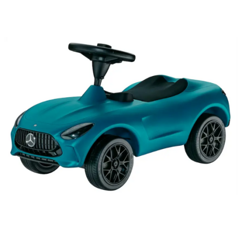 Correpasillos infantil Bobby-AMG GT en color azul híper, reproducción del Mercedes-AMG GT (C192) para niños a partir de 18 meses. Cuenta con faros y pilotos traseros LED e intermitentes, volante y detalles AMG auténticos, llantas negras con neumáticos silenciosos Michelin y adhesivos decorativos. Medidas aproximadas: 73 x 32 x 38 cm, asiento a 22 cm de altura. Fabricado en plástico por BIG Spielwaren para Mercedes-AMG