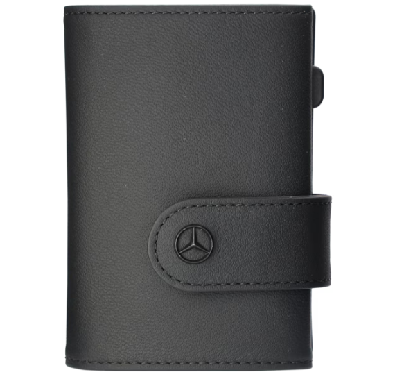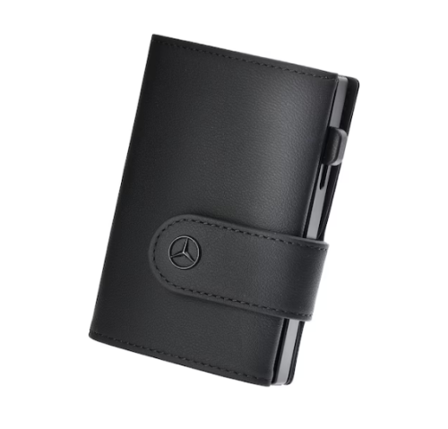 Minicartera de Mercedes-Benz Clase G en cuero auténtico del interior del vehículo, compacta para cualquier bolsillo y con espacio para billetes, comprobantes y 4-6 tarjetas. Incluye tarjetero de aluminio con protección RFID y detalles de diseño exclusivos: dibujo de la Clase G, forro con patrón Mercedes-Benz y remache de estrella en el cierre. Medidas aproximadas: 7,5 x 2,4 x 10 cm.