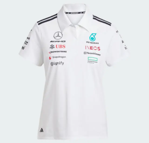 Polo de señora MERCEDES-AMG PETRONAS FORMULA ONE TEAM 2025, con diseño deportivo y detalles de rayas en los hombros, logotipos de equipo y socios en delantero, espalda y mangas. Confeccionado en 74 % poliéster reciclado, 19 % algodón y 7 % elastano, combina comodidad, tacto agradable y resistencia. Disponible en tallas XXS a XXL. Fabricado por adidas para Mercedes-Benz.