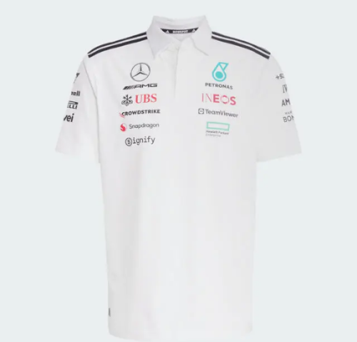 Polo de caballero MERCEDES-AMG PETRONAS FORMULA ONE TEAM 2025, con diseño deportivo y detalles de rayas en los hombros, logotipos de equipo y socios en delantero, espalda y mangas. Confeccionado en 74% poliéster reciclado, 19% algodón y 7% elastano, ofrece tacto agradable, comodidad y gran resistencia. Fabricado por adidas para Mercedes-Benz.