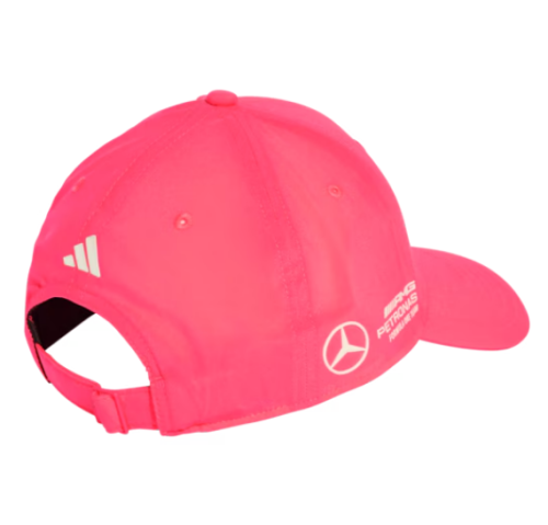 Gorra Mercedes-AMG PETRONAS Formula One Team Special Edition Miami 2025 en color rojo coral, fabricada en 100% poliéster reciclado. Diseño deportivo con estrella Mercedes y logotipos del equipo adidas y Mercedes-AMG F1. Tamaño ajustable para un ajuste cómodo y versátil. Fabricada por adidas para Mercedes-Benz.